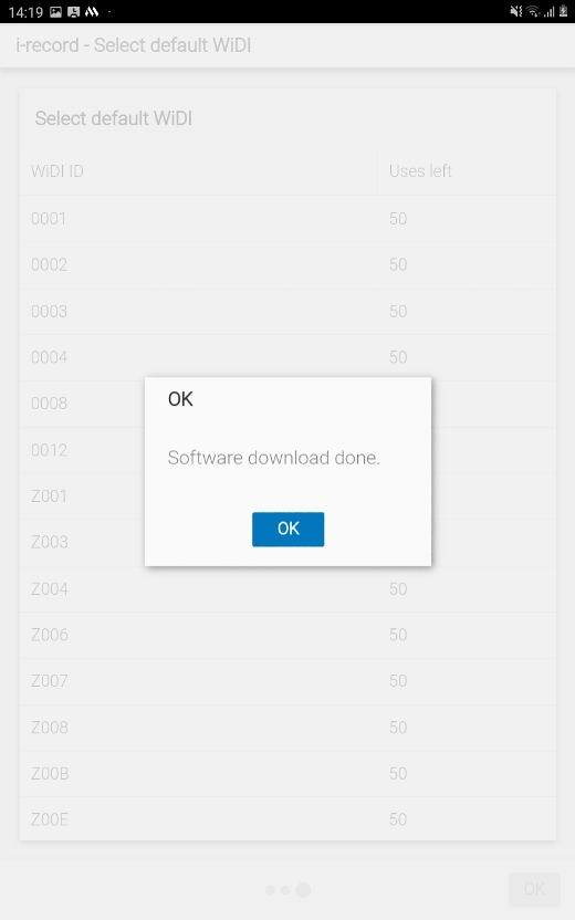 If the access data is correct, the app will connect to the i-record server. The required data, such as licenses and software update packages are downloaded. When this process is completed, the following message appears: