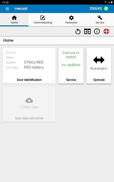 The home screen provides a good overview of the condition of the door. At a glance, central information of the connected door is visualized here, in particular the operating mode set, any errors, as well as existing, new software updates. If the i-record app is not connected to a door, only the tile for the data synchronization with the record server is active.