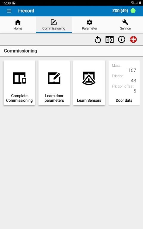 Under Commissioning you can choose between full commissioning (door and sensor learning), door learning and sensor configuration.