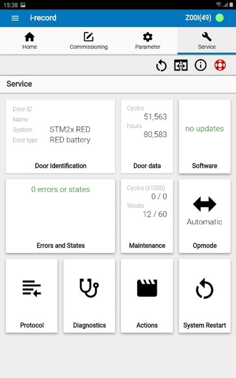 Finally, the service area has an important meaning for the technician. Here he has access to all information and functions required for service and maintenance. Here, among other things, door data, the status of the software, current errors, maintenance counters and the operating mode. In addition, the software can be updated, the protocol read out, the inputs displayed (diagnosis) and various other functions executed with only a few clicks.
