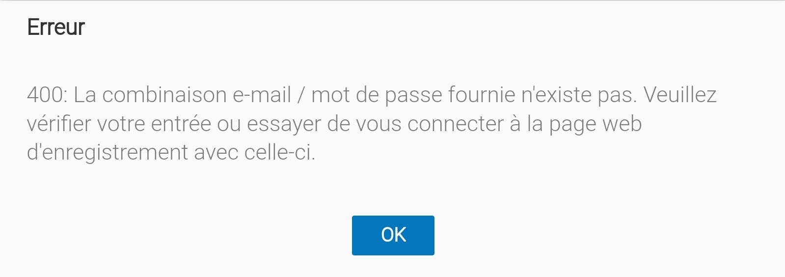 Si un utilisateur déjà inscrit dans l'app reçoit le message d'erreur ci-dessus, il est très probable que l'adresse e-mail ou le mot de passe du site web record ait été modifié. Comme l'adresse e-mail et le mot de passe d'i-record correspondent à ceux du site web record, on peut, pour tester la combinaison e-mail/mot de passe, essayer de se connecter sur le site web record. Si le login y est réussi, le login avec les mêmes données devrait également être possible dans l'app i-record.