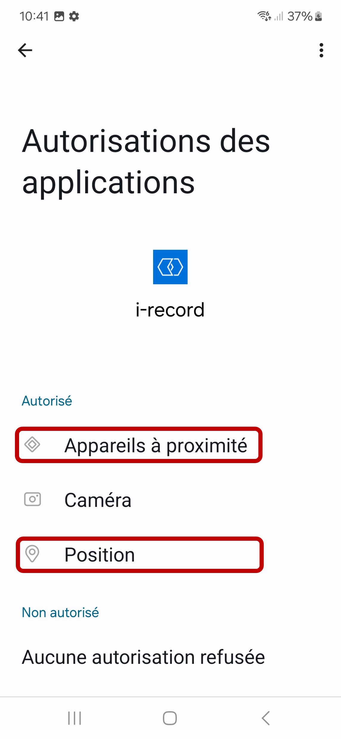 Sur votre appareil Android, ouvrez Réglages --> Apps --> i-record. Sous Autorisations, vous devez activer 'Position (GPS)' et 'Appareils à proximité' (voir deuxième image ci-dessous).